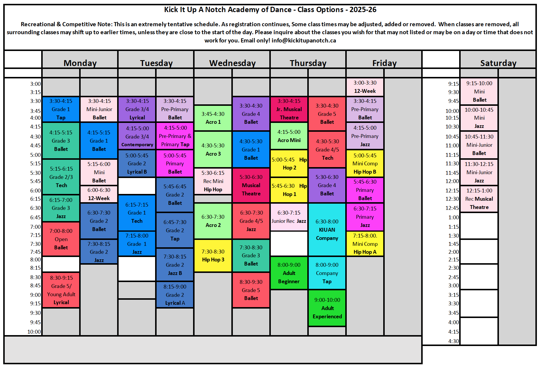 Note: This is a tentative schedule. As registration continues, some class times may be adjusted, added or removed. When classes are removed, all surrounding classes may shift up to earlier times, unless they are close to the start of the day. Please inquire about the classes you wish for that may not be listed or may be on a day or time that does not work for you. Email only at info@kickitupanotch.ca.